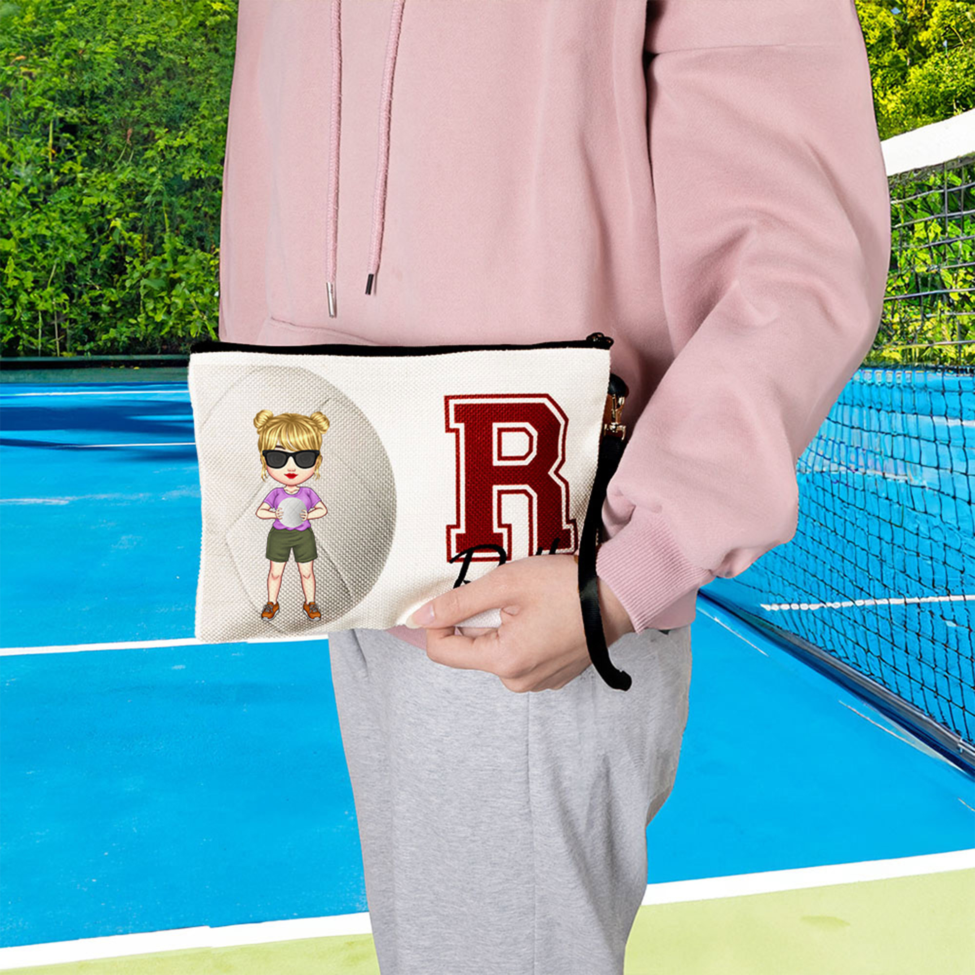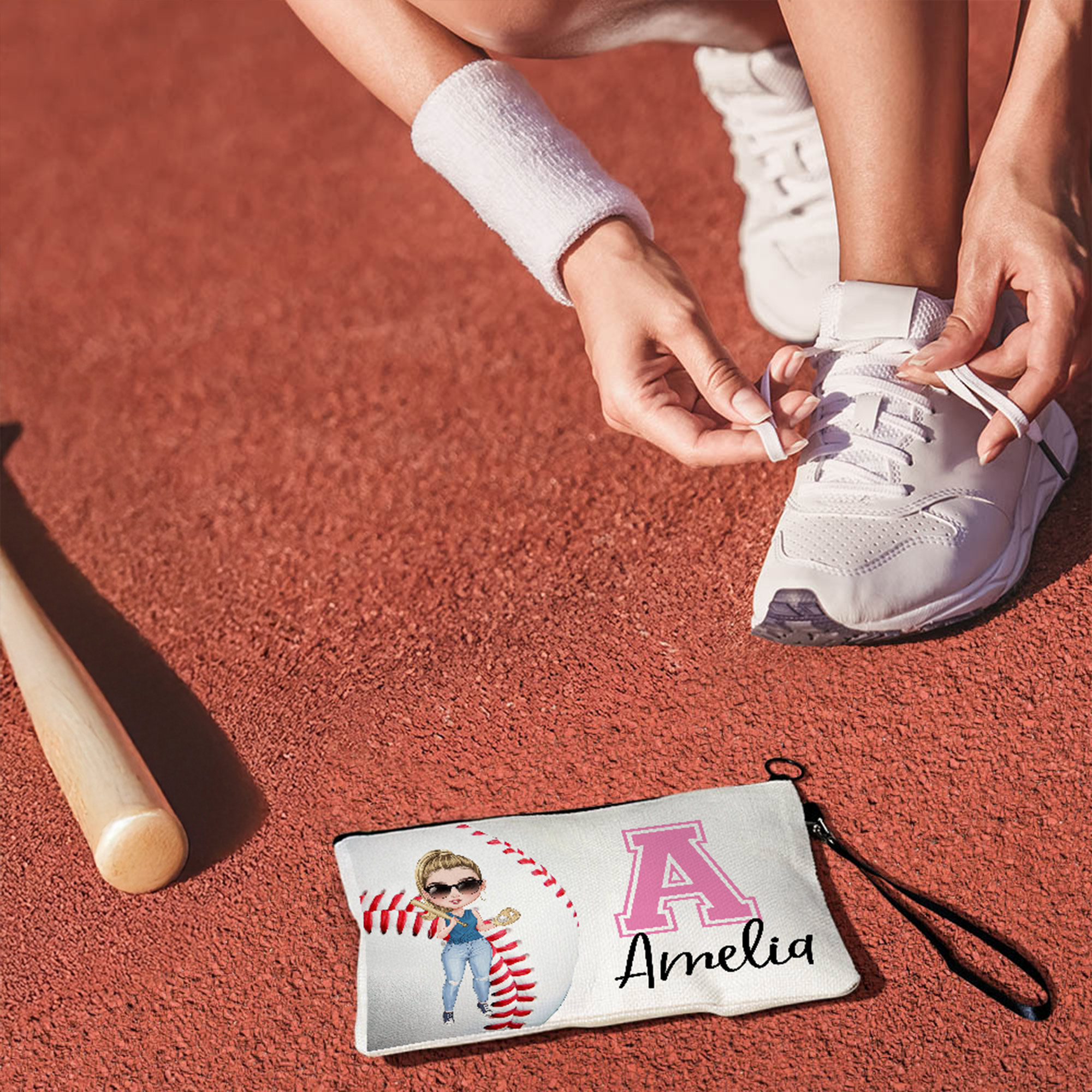 Personalized Design - This cosmetic bag features a fun cartoon character representing a sports woman, customized with their name and initial, making it a unique accessory for any athlete.